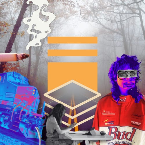 He was tall and wiry. A shaggy mullet framed a sharp profile and large wire glasses. His eyes were cast to the ground as he took a drag of a cigarette; When he looked up to exhale he saw her. Moving with a strange grace, his limbs found sure footing over the gravel of the shoulder, navigating the roots of the kudzu and sumac along the roadside.